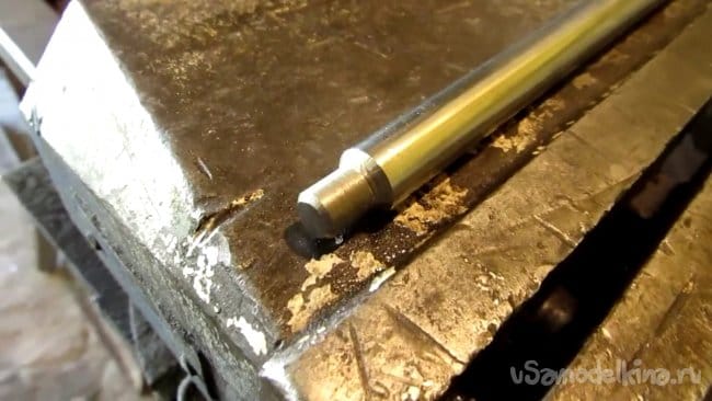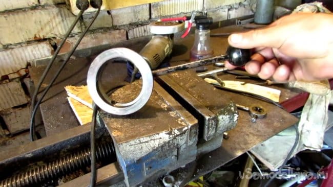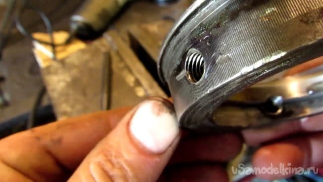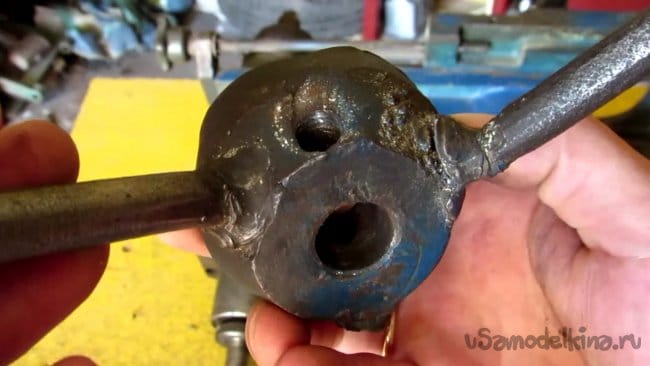 Пропилил ножовкой по металлу паз и попеременным движением влево и вправо он довольно легко выкрутился с помощью отвертки и плоскогубцев. Резьба внутри целая и это радует, но решено было прогнать её метчиком М8. Со второй ручкой тоже получилось всё удачно. Как и в первой детальке, прошлифовал лепестковым кругом сварку и левым сверлом при рассверливание отверстия обломыш выкрутился. Осталось самое больное место. Электродов здесь не пожалели и заварили будь здоров. Ну засранцы. И опять на помощь приходит болгарка, которой срезаем всё лишнее. Кстати 80% всех самоделок делается с помощью сварки и болгарки. Внимательно присмотревшись, этот кусочек легко выбился с обратной стороны. Просто на прутке не было резьбы и её вставили в отверстии и заварили. Теперь прогоняем резьбу и сошлифовываем сварку. Получаем вполне себе ничегошную детальку. Порывшись в запасах, нашёл почти готовую ручку для гайки и даже с шариком. Решил что пока будет одна ручка. Если будет неудобно, всегда можно выточить две остальные.