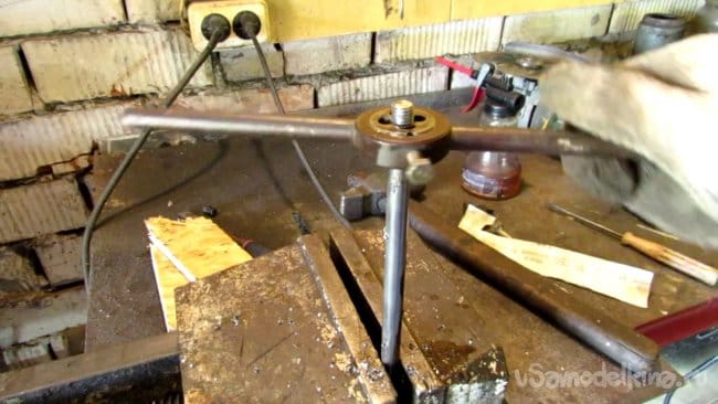 Накернил углубление в центре и прошёл сверлом 4 мм, потом попробовал 8 мм, и здесь мне на глаза попалось левое сверло диаметром 5 мм. Часто бывает, что при сверлении этими сверлом его закусывает и обломившийся кусочек сам выкручивается. Мне повезло, и таким методом я выкрутил все три заломыша. Далее, подправим деталь всё тем же лепестковым кругом, убирая сопли от сварки и выравнивая поверхность. Осталось изготовить ручки. Для них, как нельзя кстати, подошли штоки от амортизаторов. Они диаметром 11 мм, а резьба нужна М10. Зажимаем пруток в патрон токарного и протачиваем конец заготовки до диаметра 10 мм, длина проточки около 15 мм. Мне напечатали на 3D принтере шарики. У них есть центральное отверстие под резьбу М8. . Хватаем метчик и нарезаем внутреннюю резьбу. Здесь важно не переусердствовать, а то можно выдавить верхнюю часть шарика. Резьба нарезается от руки, ничего никуда зажимать не нужно. С другой стороны протачиваем заготовку до диаметра 8 мм и длиной примерно 10-12 мм. Как же это круто выточить то, что тебе нужно. Не надо часами искать в ящиках нужную тебе хреновину и допиливать её болгаркой и напильником. Красота. Обязательно в начале делаем фаску для лучшего захода лерки. Как-то так это выглядит. Теперь нарезаем резьбу не забывая капнуть масла. Режем по пол оборота вперёд и немножко назад, этим самым обламывает стружку. Когда резьба нарезана на неё без проблем накручивается шарик. Такую процедуру нужно повторить для двух оставшихся прутков. В итоге имеем вот такую рукоятку. Жаль что один шток оказался потёртым и это немного портит вид, ну подвернется подходящий, переделать не долго.