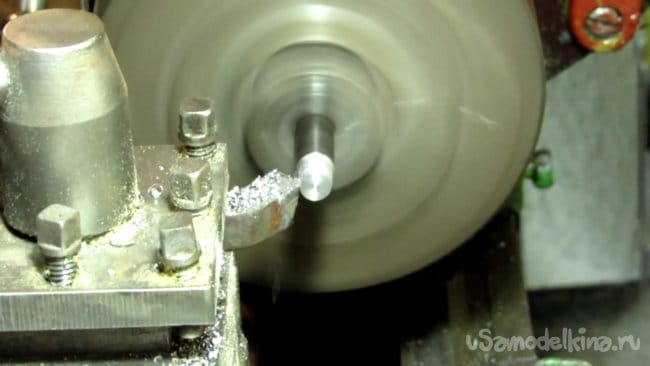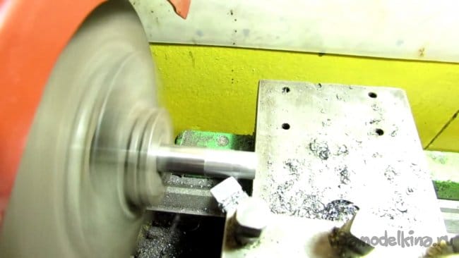 Теперь переходим к двигателю. Родной шкив был срезан болгаркой. Порывшись в закромах нашёл кусочек вала с резьбой. Вроде когда то это был генератор или насос гур от машины. На него надевается шайба, сам шкив и всё это зажимается гайкой. Диаметр этого вала 15 мм, а вал на моторе 9,5 мм. Немного подумав, решил что самым лучшим видом соединения будет запресовать один вал на другой. Ну раз так, тогда идём к токарному. Зажимаем заготовку в патрон и засверливаемся центровочным сверлом. Делать это нужно обязательно. Углубление поможет сверлу войти в металл в нужном месте. Без него сверло легко может увести в сторону нарушая соосность. Далее я поставил сверло диаметром 4 мм и прошёл на необходимую глубину. Потом рассверлил сверлом 9 мм и расточным резцом подогнал отверстие до необходимого диаметра. После запрессовки прихватил сваркой шайбу и два вала на всякий случай. Ну мало ли, провернёт там или ещё чего. Теперь займёмся моторной плитой. Здесь есть 4 отверстия для крепления родного электродвигателя. Для этого мотора они естественно не подошли и пришлось просверлить ещё два отверстия. Вставил туда длинные болты и через большие шайбы прикрутил мотор. При натяжке ремня такое крепление мне показалось не очень жёстким. И на всякий случай с обратной стороны мотора на существующие отверстия прикрутил кусочек уголка. Теперь всё жёстко. Также между плитой и мотором пришлось поставить проставки чтобы подогнать шкив по высоте. После всех примерок плита была покрашена.