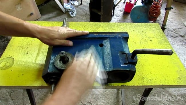 Теперь приступим к шпиндельной бабке. Выкручиваем ручку натяжение ремня и снимаем моторную плиту. Она нам пока не понадобится. Кстати сидит она на пазах типа ласточкин хвост Также имеется прижимная пластина. Закручивая винты сбоку, можно убирать люфт. В шпиндельной бабке особо ремонтировать нечего, поэтому вооружаемся наждачкой и зачищаем краску. Снимать полностью краску на отлитой из чугуна детали я не стал, так как там присутствует заводская шпаклевка похожая на современную, с добавлением алюминиевой пудры. А на фрезерованных поверхностях краска легко удаляется шабером, на скорую руку изготовленным из напильника. После всех процедур зачистки обезжирил и покрасил тёмно-синей краской из баллончика. Замечательно то, что время высыхания у неё 10 минут.