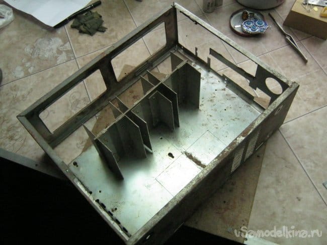 Блок питания собран в старом железном корпусе от системного блока PC на процессоре 80286. Это еще без радиаторов и обдувающих вентиляторов. Корпус небольшого размера, сделан из стали значительной толщины. Представляет собой сварную коробчатую раму и П-образную крышку. Маленькой УШМ удалось выпилить внутренние специализированные отсеки, металлическое основание для установки материнской платы впаял на свое место газовой горелкой. Это увеличило жесткость конструкции.