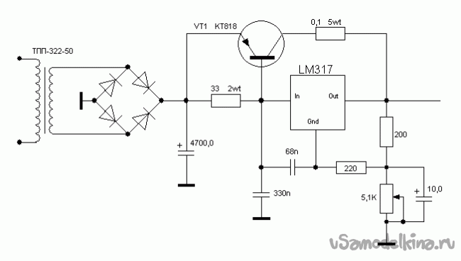 Вариант включения LM317 с внешним регулировочным транзистором. Схема электрическая принципиальная.