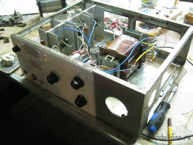 Сетевой трансформатор – ТС180-2 с перемотанными вторичными обмотками. Кроме силовых вторичных обмоток, были намотаны и две относительно слаботочных обмотки для двуполярных стабилизаторов питания измерительных приборов. Катушки трансформатора пропитаны лаком, что позволило свести к минимуму его акустический шум (гудение) и позволило надеяться на длительную работу со старым обмоточным проводом.