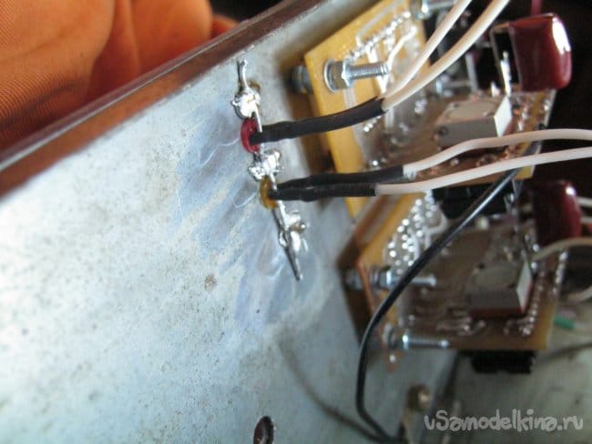 Выходные клеммы – минусовая привинчена прямо к металлическому корпусу, изнутри к ней припаян отрезок толстого луженого провода, куда сводятся все «земляные» концы. Плюсовая клемма удлинена и изолирована – к ней припаян отрезок винта М4 и сделан текстолитовый изолятор.