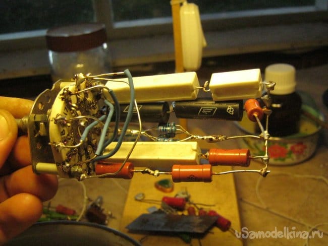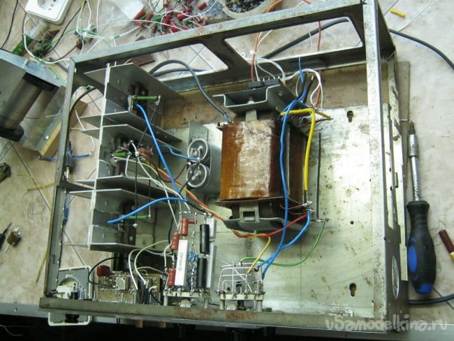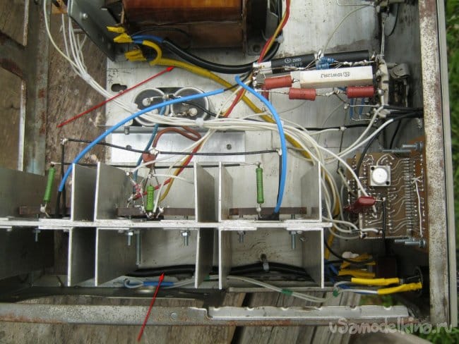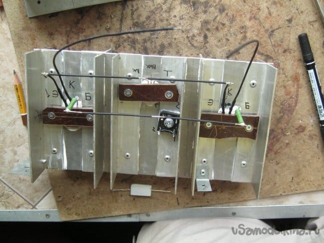 На жестких выводах установочных элементов смонтированы и несколько мелких элементов с тонкими выводами. После проверки работоспособности, часть схемы, помещенная на радиаторе, устанавливается в корпус и подключается короткими проводами значительного (при необходимости) сечения. Проверка работоспособности.