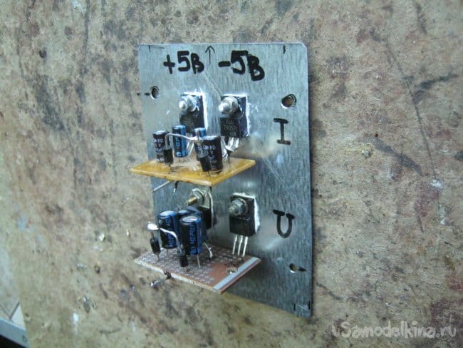 Два независимых источника собраны на отдельных платках и закреплены за штатные фланцы микросхем (корпус ТО-220). Потребляемый измерительным прибором ток невелик, поэтому микросхемы стабилизаторов применены в пластиковом исполнении, что позволило крепить их без изолирующих прокладок. Единственная 7805 с металлическим фланцем (вывод GND микросхемы) в БП вольтметра также установлена без изолирующей прокладки, это допустимо схемой.