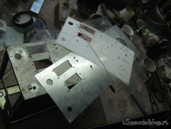 Штатная панель корпуса, будущая в конструкции лицевой, оказалась с вентиляционными проемами и отверстиями, пришлось делать фальшпанель. Пояснительные надписи, шкалы и.т.д. вычерчены в AutoCAD и распечатаны с фотографическим качеством на специальной плотной бумаге. Отверстия и проемы вырезаны скальпелем. Сверху лицевая панель прикрыта прозрачной панелью из органического стекла. Панель вырезана ножовкой по металлу, внутренние отверстия выпилены лобзиком по дереву, мелкие просверлены. Панели не имеют специального крепежа, все удерживается штатным крепежом установочных элементов.