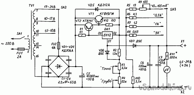 Схема имеет следующие особенности – переключаемая (переключателем SA2) вторичная обмотка трансформатора TV1 для понижения нагрева регулирующего элемента стабилизатора. Усиление микросхемы DA1 стабилизатора выносным транзистором VT1. Регулятор тока срабатывания защиты микросхемы на элементах R5…R9, SA3.