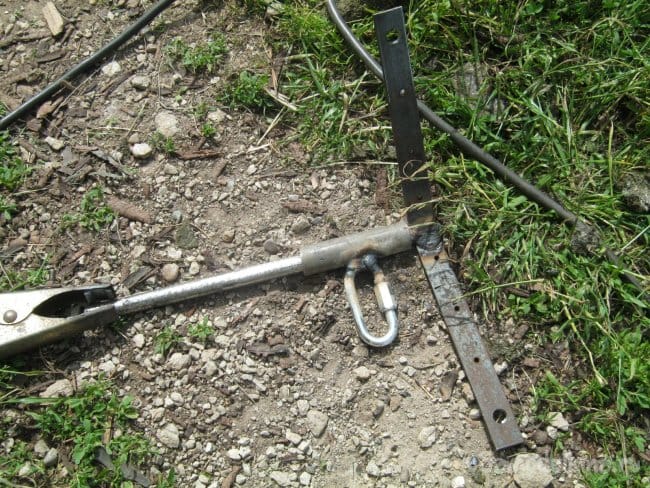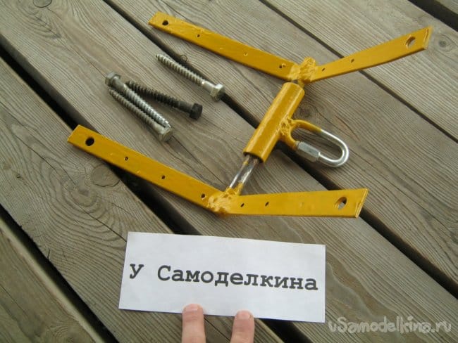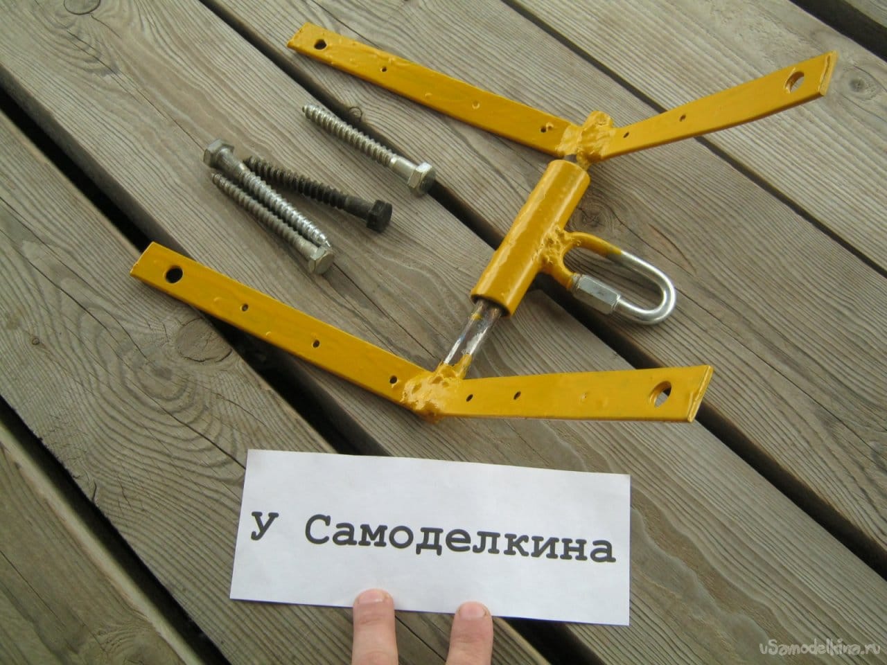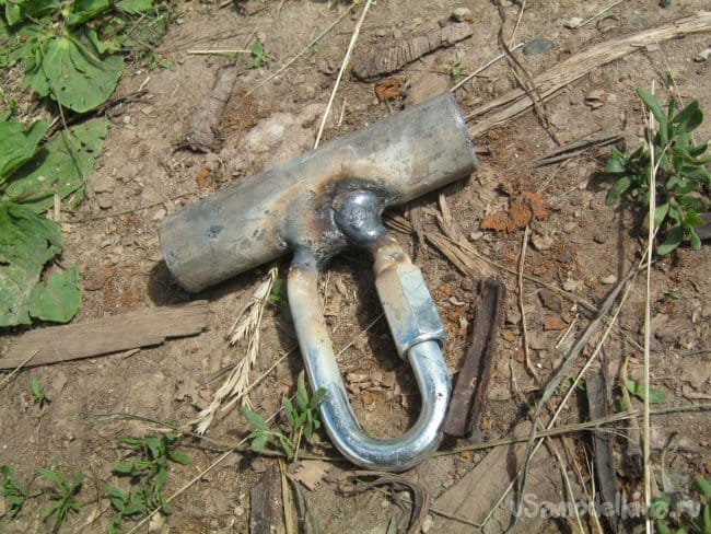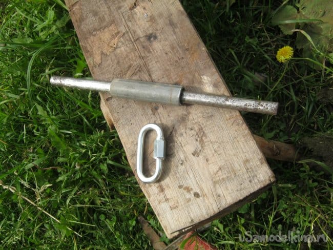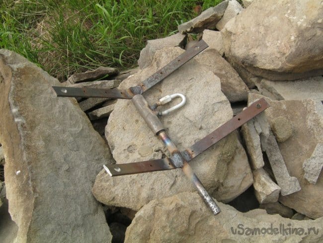 К середине трубе был приварен большой «пожарный» карабин. Все, детали готовы, можно приступать к сборке. На стержне-оси выбрана наименее пострадавшая от ржавчины часть, она и будет рабочей. К краю оси приварены две крепежные лапы под углом, этак, градусов 120, друг от друга, на ось надета качающаяся часть и аналогичным образом приварены две оставшиеся лапы.
