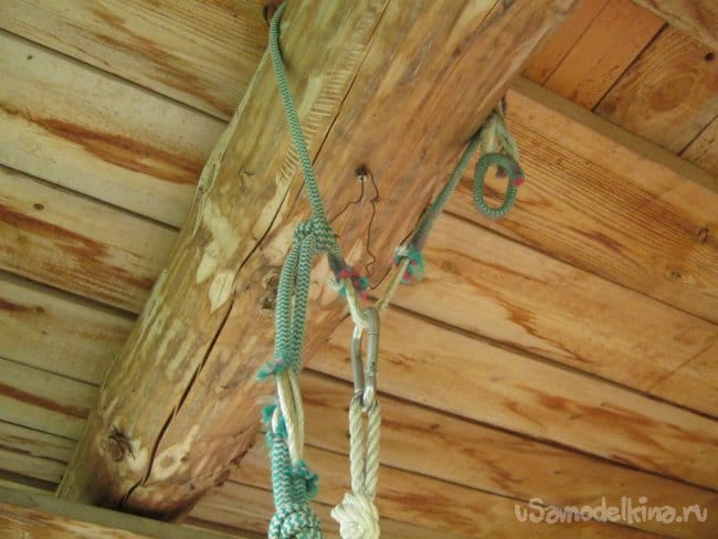 История рождения железки такова – несколько спортивных снарядов, качель, нечто вроде тарзанки, кольца, веревочная лестница, закреплены на балках-бревнах большой открытой веранды дома. Некоторые из снарядов пользуются особенной любовью, но применяются не совсем по назначению. Например, одно из колец используется в качестве этакой качалки-крутилки. На пируэты ребенка на этом кольце даже смотреть страшно. Естественно, приходится следить за техническим состоянием всего этого свисающего с потолка инвентаря. Веревочный подвес для такого рода использования кольца держится в приличном состоянии на удивление недолго. Несколько снизить износ удалось, установив промежуточный карабин. Его гладкая поверхность немного уменьшает износ веревки, требовалось, однако, нечто более радикальное.