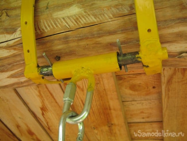 Проблема в том, что подвесу требуются, как минимум две степени свободы, в то время как обычные качельные, имеют только одну. Конструкции учитывающие это, показались чрезмерно сложными, решено было использовать обычный, односвободный, но достаточно прочный, чтобы противостоять усилиям, направленным в нерабочие стороны. Конструкция подвеса была подсмотрена в деревне, на старой качеле. Конструкция весьма проста, возраст качели намекал на удачность решения.