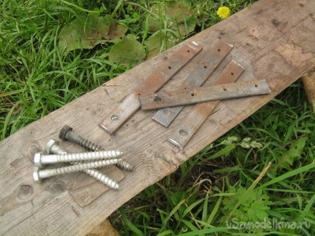 Из куска неширокой стальной полосы отрезал четыре кусочка. Это будут крепежные лапы. Обрезки использовались из отходов, отсюда мелкие отверстия. Для привинчивания лап к бревну-подстропильной балке, подобрал четыре мощных шурупа с головкой под ключ, просверлил в железках соответствующие отверстия.