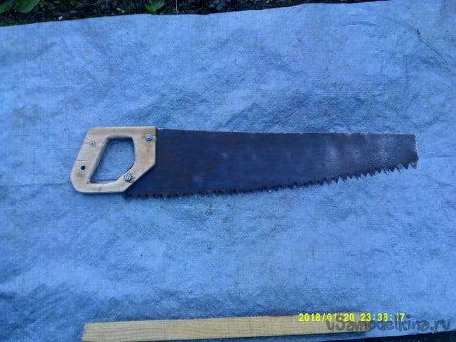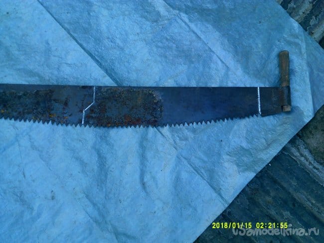 На двуручной пиле мелом отмечаем контур будущей ножовки длинной 50см.