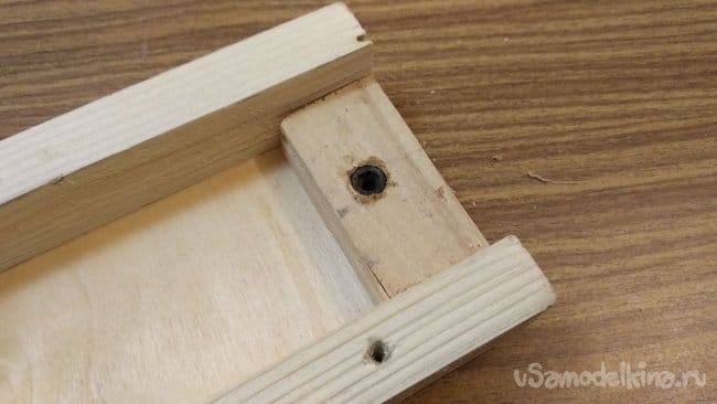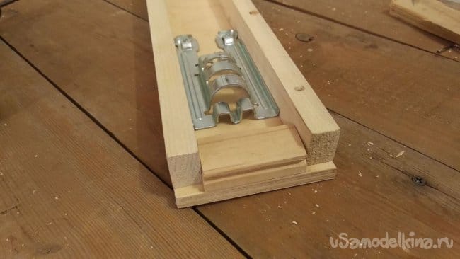 5. Используя простое приспособление из деревянных отрезков бруса выполняем под прямым углом отверстия 6 мм по краям направляющей.