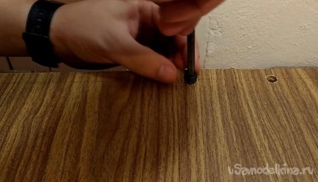 7. Рассверливаем до диаметра 10 мм полученные отверстия на глубину 10…12 мм и устанавливаем мебельные ввертные гайки (известны также как футорки).