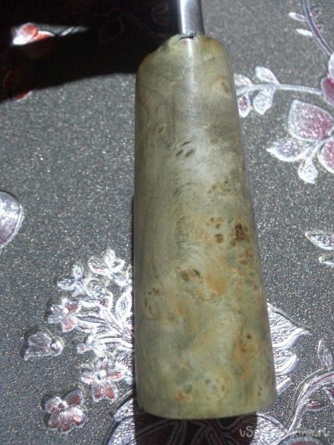 Приступаю к ручке. Для ручки у меня есть кап клена, уже сухой. Просверливаю отверстие в центре бруска, заливаю эпоксидную смолу, прессую без всякой гарды. Немного перестарался когда, забивал и чуть трещинка пошла. Все дефекты заливаю клеем.