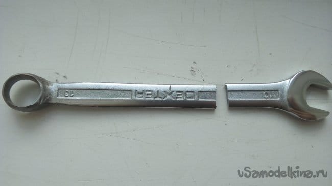 Чтобы насадить рукоять на изделие, необходим хвостовик. Для этого отпилим от ключа две трети со стороны режущей кромки.