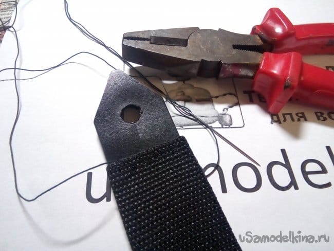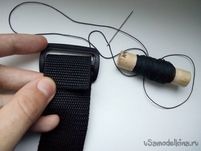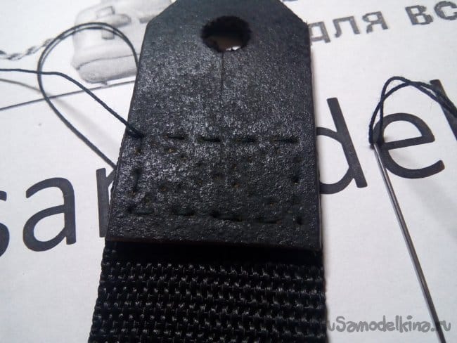 Пришиваем нейлоновую ленту к куску ремня толстой нитью, помогая себе плоскогубцами. Попадать в заранее проделанные отверстия довольно сложно, но через некоторое время можно привыкнуть. Если никак не можете попасть иголкой в отверстие, то повторно расширьте его шилом.