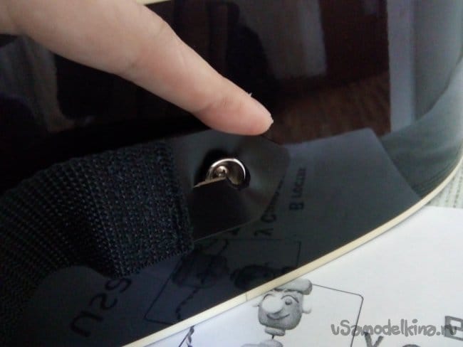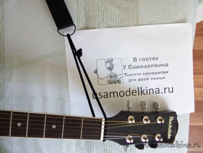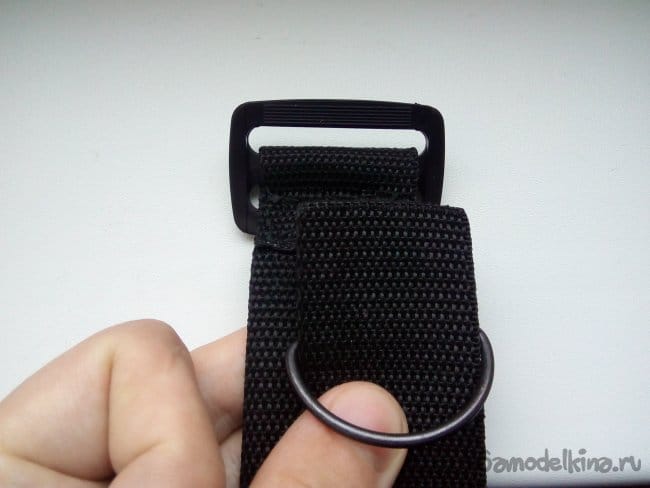 Надеваем ремень на пуговицу для ремня и привязываем гриф к полукольцу: