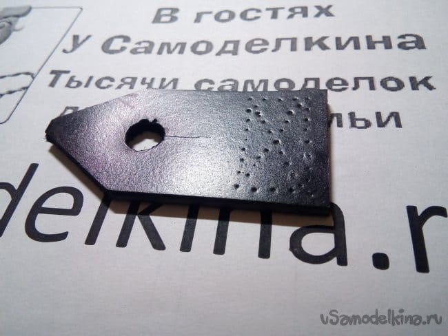 Теперь займёмся куском кожи. В моём случае это кусок ремня, ведь он идеален для этих целей. Можно взять кусок любой ширины и обрезать лишнее. Сначала я сделал эскиз того, что я хочу получить. Все размеры я брал произвольные, поэтому сами рисуйте то, что хотите получить. Скажу лишь, что диаметр отверстия должен быть 10 мм. Но рекомендую самостоятельно провести замеры. Также я решил не сверлить новое отверстие, а лишь расширить старое.
