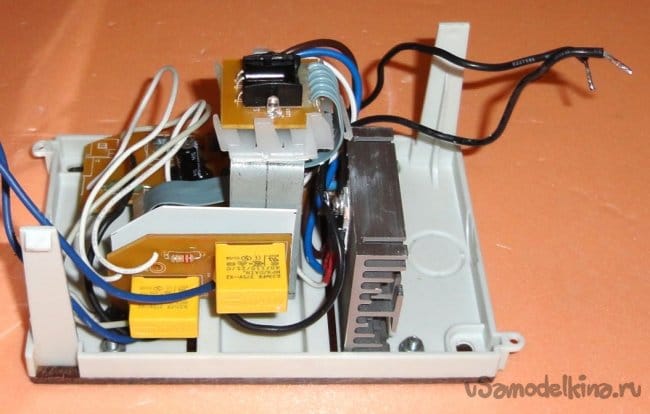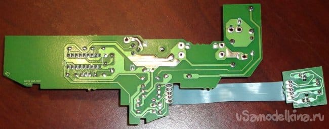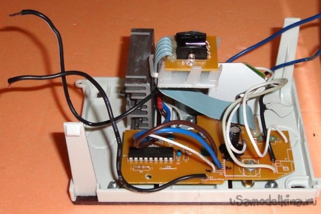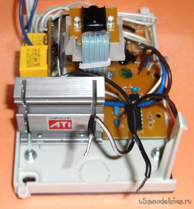 Для монтажа в корпусе из-за размеров пришлось плату разделить на две части в районе места для родного выключателя. И отрезать лишние поля. Части платы соединены минимальным количеством монтажного провода. В районе свободного от дорожек пространства сделал отверстия для крепежа. Родной радиатор пришлось заменить. Так, как он был «микроскопическим» и справлялся со своей задачей за счёт своего расположения в воздушном потоке корпуса пылесоса. Поставил более габаритный радиатор от старой видеокарты из компьютерного хлама. Родной симистор BTA212-600 заменил на BTA12-600 т.к. он в отличие от предыдущего имеет изолированный теплоотвод. И при установке на радиатор не требуется дополнительных изолирующих прокладок. ИК приемник закреплен на пластине, изготовленной из задней заглушки от корпуса компьютера.