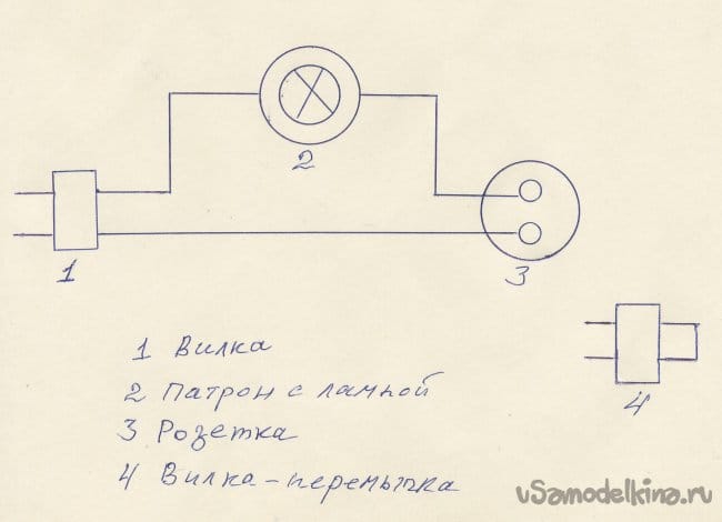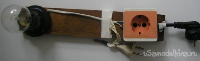 Две сетевых вилки с негодных шнуров, старый патрон с лампочкой 230 В 60 Вт, цоколь E27, розетка, паркетная дощечка, изолента и крепёж.