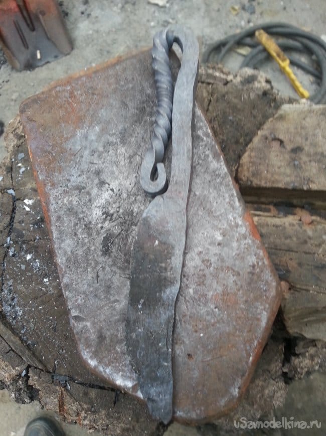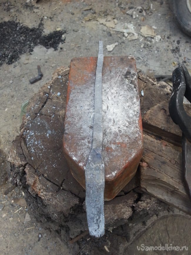 Нагреваю и даю остыть на воздухе, для смягчения металла. Нагреваю до алого цвета и кую формируя лезвие
