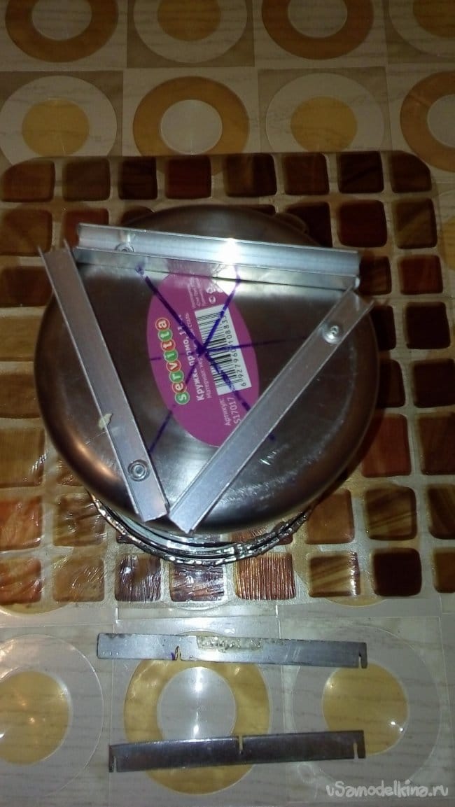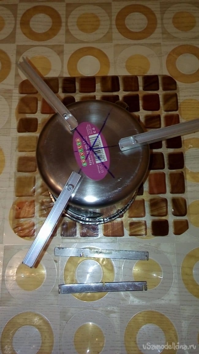 Из П-образного алюминиевого 10 мм профиля изготовил три отрезка длиной 10 см, которые будут стойками. В них на расстоянии 1,5 см просверлил отверстия 3,5 мм. Эти отрезки с помощью стальных заклепок 3,2 х 6 мм закрепил на отверстиях дна большей кружки.