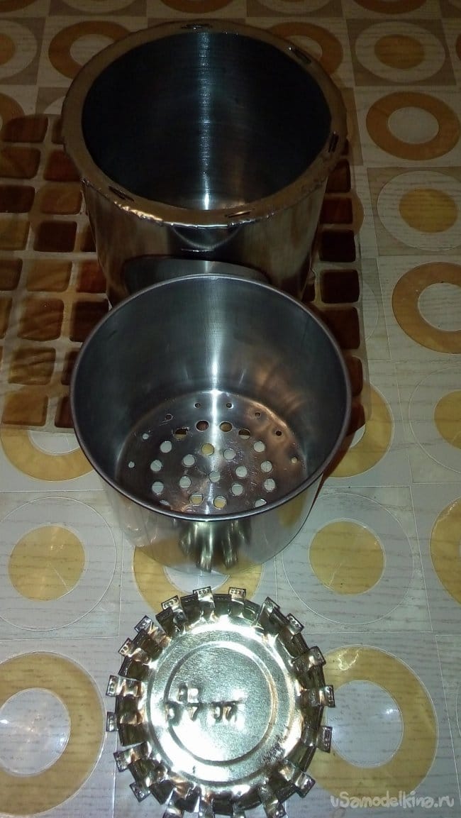 В интернете гуляет много конструкций печей-щепочниц. В большинстве своем в качестве основы для конструкции печей используют кружки из пищевой нержавеющей стали, размеры и формы которых разнообразны.