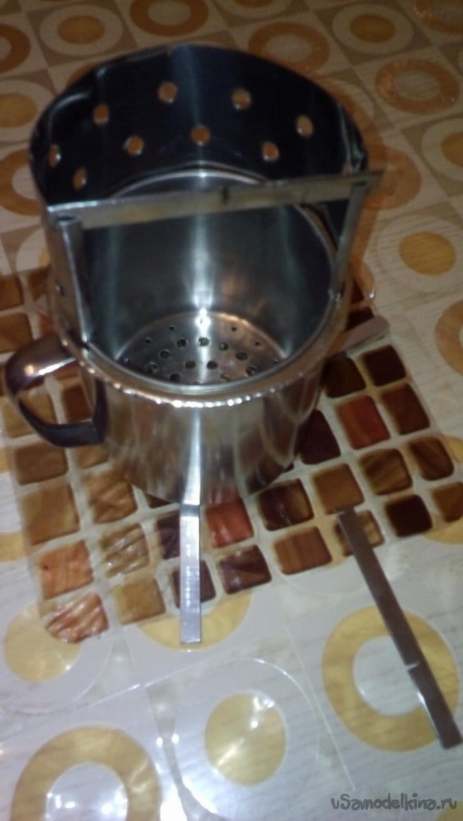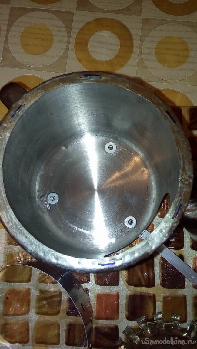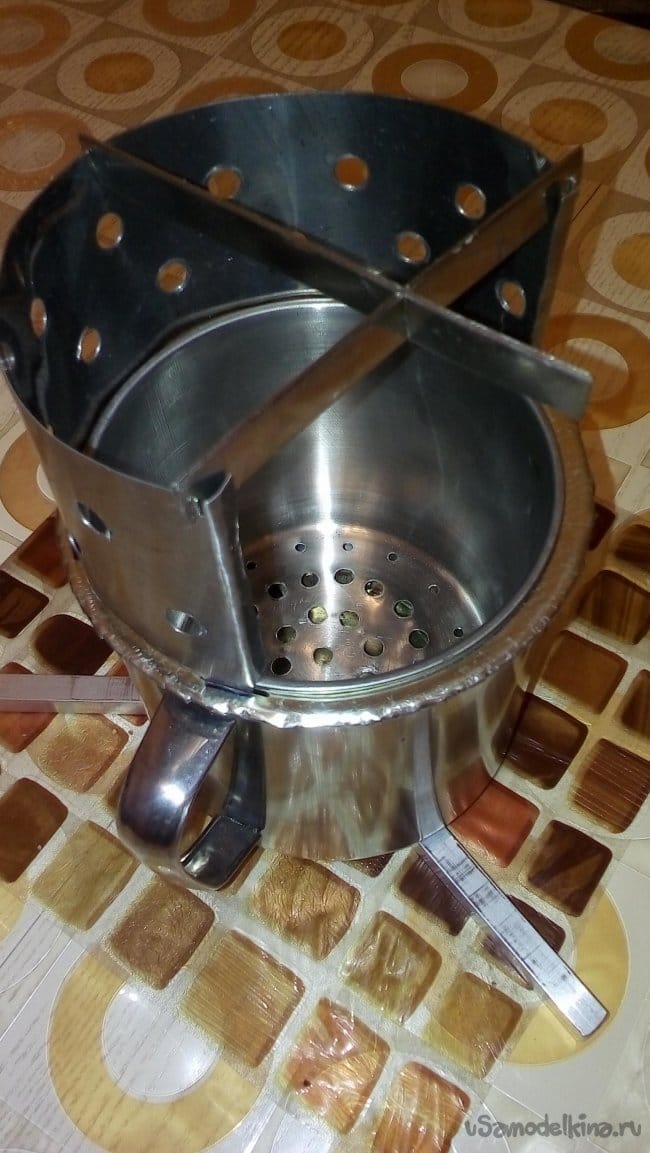 Для большей устойчивости всей конструкции печи я установил на дно большей кружки поворотных ножек (разворачиваются на стальных заклепках), которые приклепаны снаружи дна большей кружки.