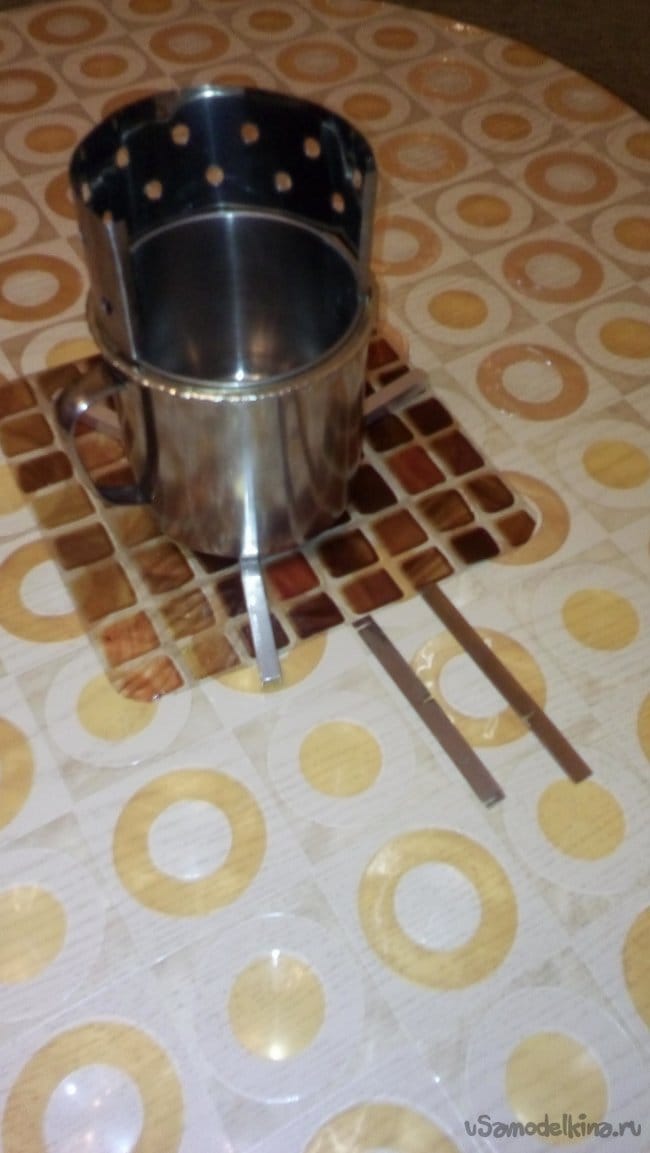 В интернете предлагается в дне кружки большего диаметра вырезать отверстие для того, чтобы в это отверстие вставлялась кружка чуть меньшего диаметра (без ручки) - топка. Затем в дне меньшей кружки делаются отверстия для притока воздуха в топку.