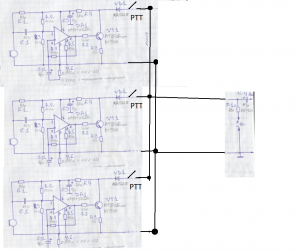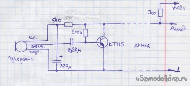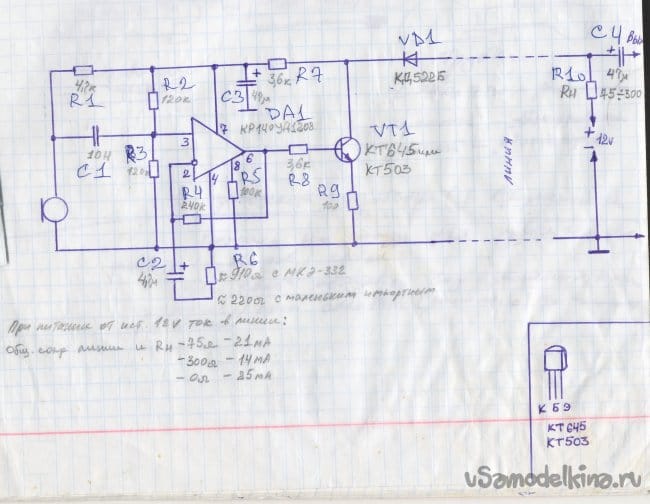 Напряжение питания от источника через линию и диод защиты от переплюсовки VD1 поступает на коллектор выходного транзистора VT1, экономичный операционный усилитель DA1 и электретный микрофон.