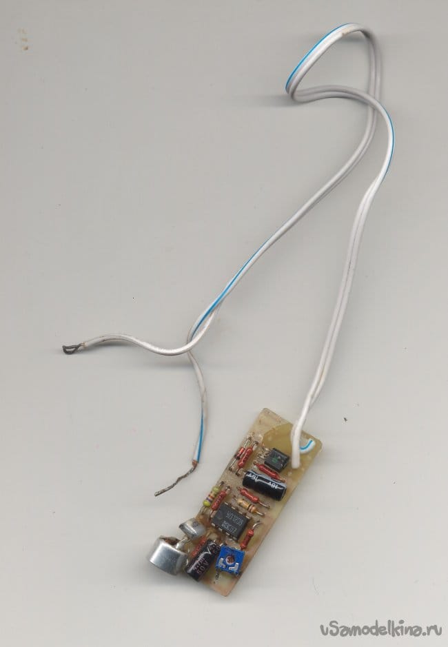 В плюсовой провод питания включён фильтр R7C3, он нужен для правильной работы микрофона и операционного усилителя. Выходной транзистор, являющийся усилителем тока, включён до фильтра. Таким образом удаётся разделить звуковой сигнал и питание, подаваемые по одним и тем же проводам.