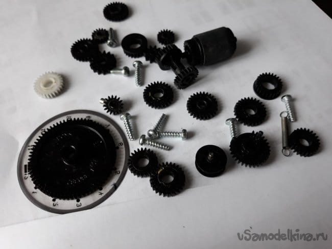 Когда открыл одну из них, увидел свой первый принтер. Решил под разобрать его, может что и сгодиться в хозяйстве. После разборки в моем распоряжении оказались куча радиодеталей, переключатели всякие, два электродвигателя и о боже – куча шестеренок.