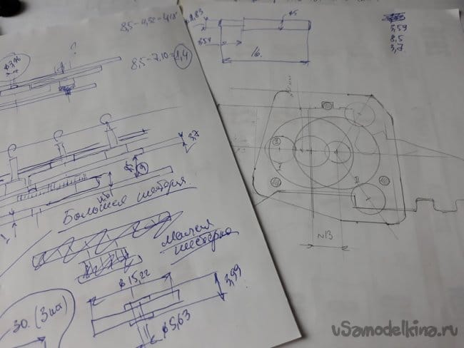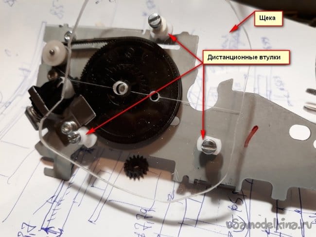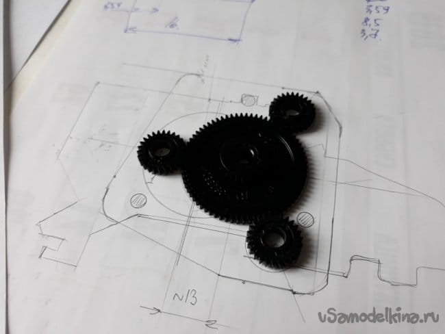 Все вроде должно получиться. К имеющемуся механизму привода, необходимо сделать дополнительно редуктор из имеющихся шестеренок. Это две дополнительные панели (щечки) на определенном расстоянии друг от друга. Между которыми находятся шестерни редуктора. По прорисовкам изготовил щеки редуктора.