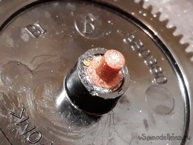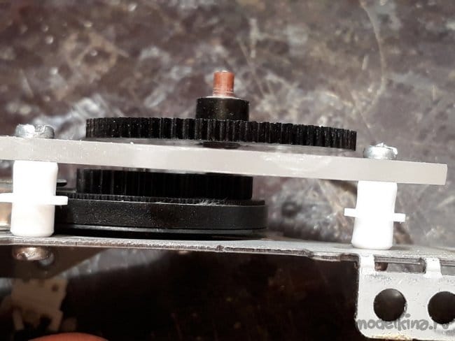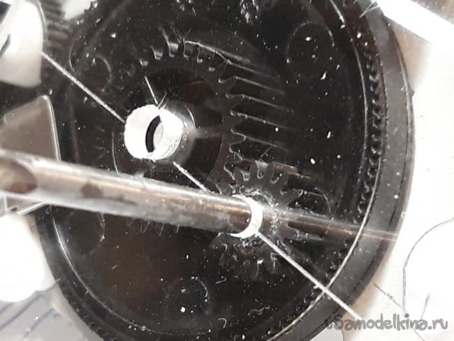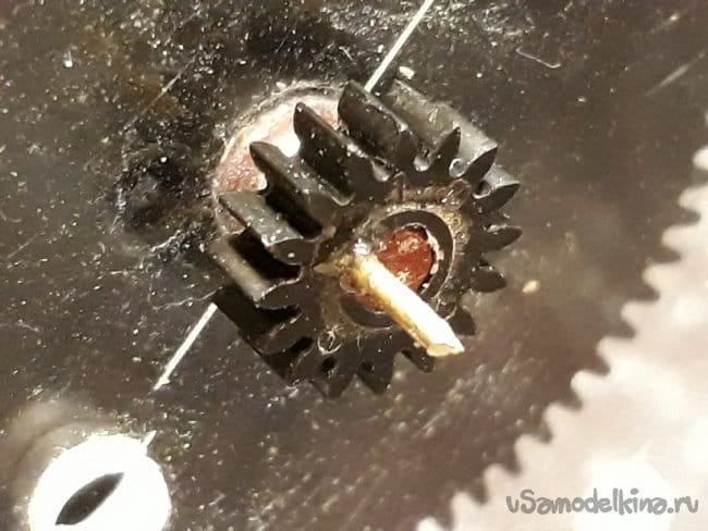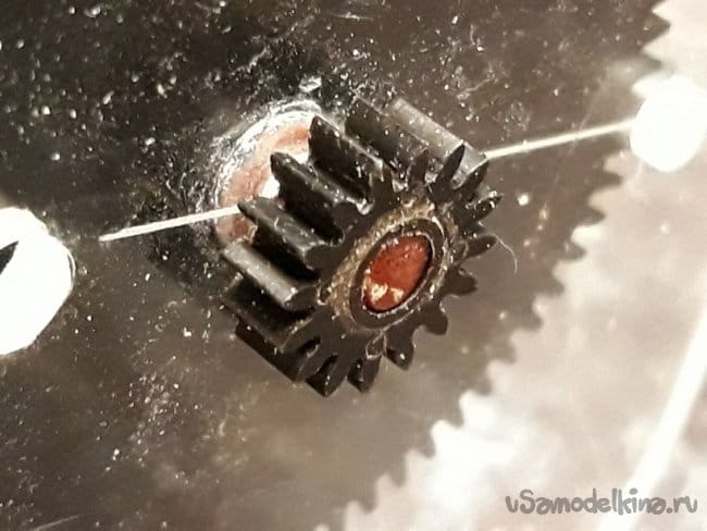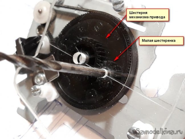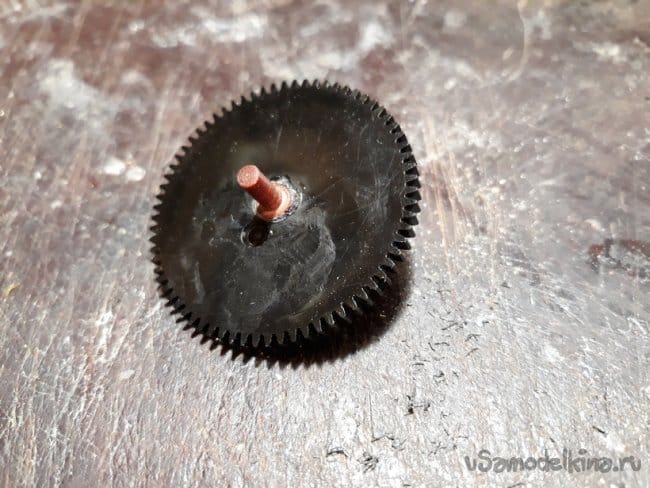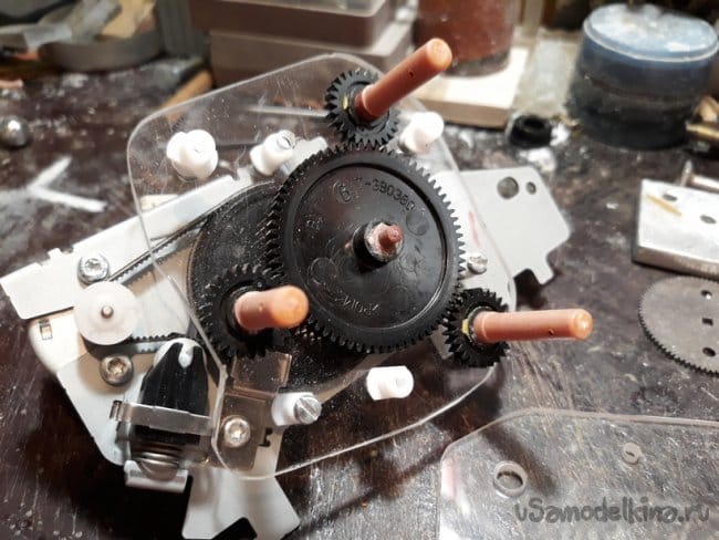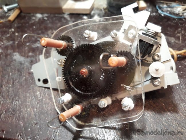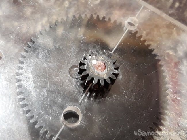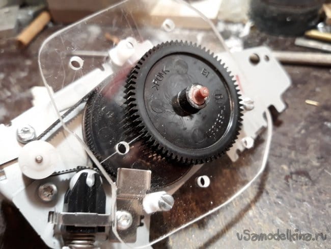 Потом выточил из текстолита ось для маленькой и большой центральных шестеренок. Насадил и закрепил большую шестерню.