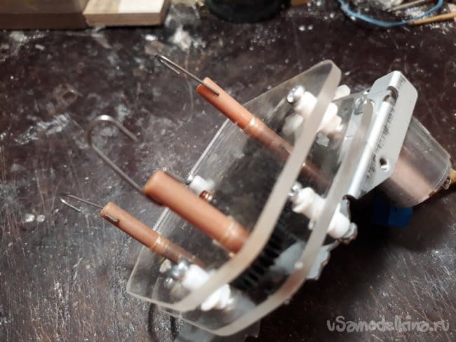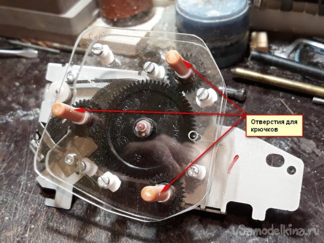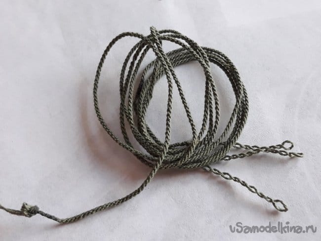 В осях были предварительно просверлены отверстия для крючков, на которых будут фиксироваться нити прядей каната. Крючки согнул из канцелярских скрепок.