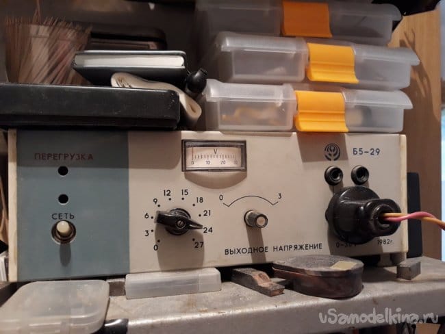 Благо тут же, на нижней полке, находится блок питания, от которого будет собственно питаться электродвигатель тросомота. Напряжение питания электродвигателя, которого 12 вольт. На блоке питания есть плавная регулировка питания в пределах 3-х вольт.