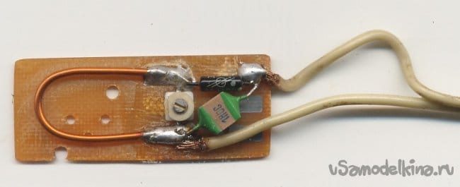 При сборке конструкции все выводы деталей на плате делают короткими. Наушник соединяется с платой любым многожильным проводом.
