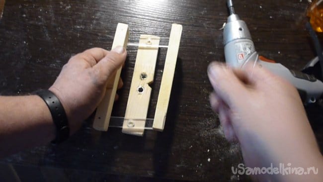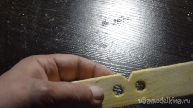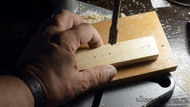 2. С торца по центру одного бруска делаем треугольный вырез на глубину примерно 5-7 мм. Отступив, в нашем случае по 12 мм от центра сверлим два отверстия диаметром по толщине металлической трубки.