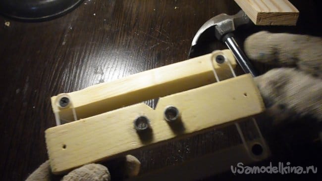 4. Запрессовываем трубки, с помощью молотка в отверстия бруска.
