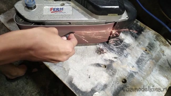 После того как мы уже провели самую опасную роботу для начинающего, нужно убрать все острые края которые могут порезать пальцы при обработки лезвия. Ну и выравниваем края на гриндере или на шлифовальном танке, как у меня. Здесь также важный этап, не перегреть металл чтоб потом не играться и не калить его, по этому параллельно макаем в воду.
