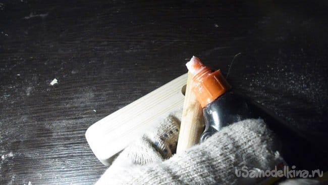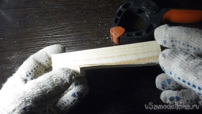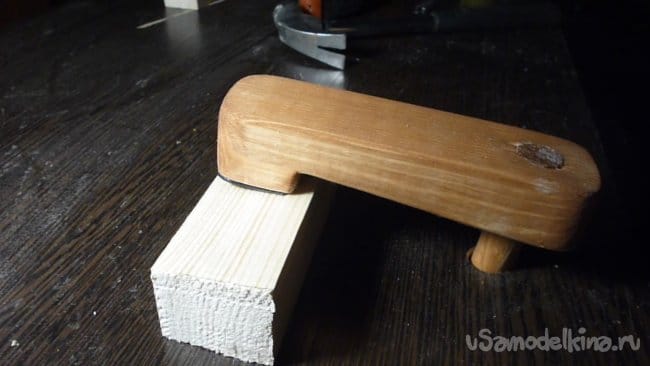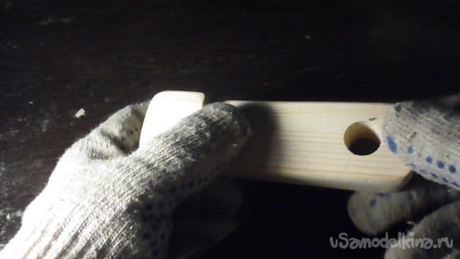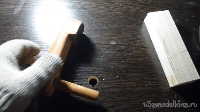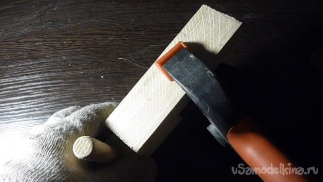 - Наносим столярный клей на круглый брусок, вставляем обработанную клеем часть круглого бруска в отверстие прямоугольного, даем высохнуть клею.