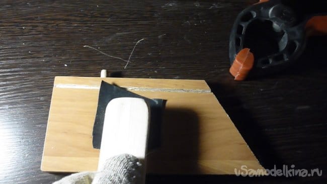 - Приклеиваем кусок кожи на рабочую часть струбцины, после высыхания клея, удаляем лишнюю часть кожи канцелярским ножем.