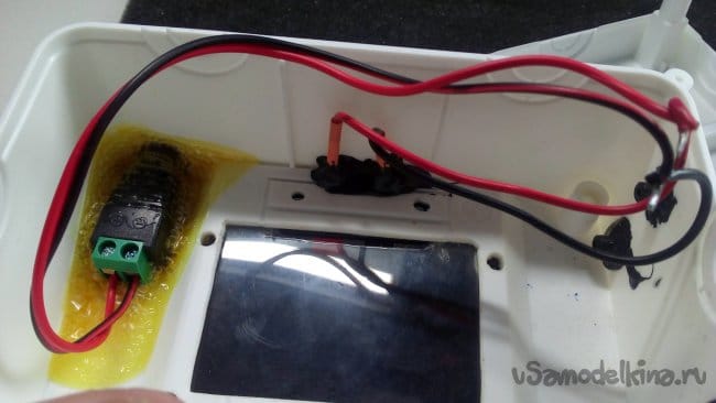 шаг5. Пайка проводов. Отрезаем термоусадку по размеру+ запас на 1см ножек акустической колодки надеваем на провод и припаиваем согласно цвету клемм (Красный - красный, черный - черный), далее греем термоусадку и отрезаем еще кусок провода для подключения к разъему питания (в центре +, вокруг -), залуживаем и затягиваем в разъеме. Разъем питания выставляем и заливаем клеем или автогерметиком. Затем пропаиваем концы проводов, идущие от разъема питания и колодки (красный - красный, черный - черный).