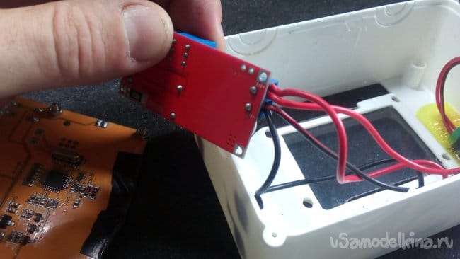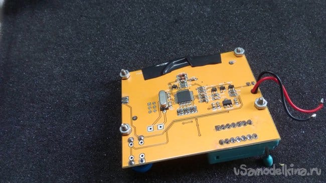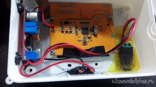 шаг9. Подключение устройства. Отключаем источник питания и берем провода от нашего тестера компонентов и подключаем к выводам клемм понижающего модуля OUT+ (Красный) OUT- (Черный). и закрепляем модуль на подготовленных ножках маленькими саморезами.