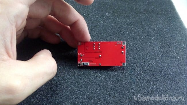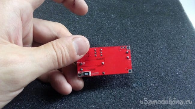 шаг7. Настройка модуля. Коли питание кроны равно 9 вольт, соответственно и на выходе с модуля должно быть 9 вольт. А где у модуля вход, а где выход????? Тут все просто. На обратной стороне модуля есть подписи под клеммами. IN+ означает входящий плюс, IN- означает входящий минус. OUT+ и OUT- выходящие плюс и минус соответственно. Зафиксировав модуль, подключаем к нему пропаяные провода от разъема питания и колодки на разъем IN+ красные, разъем IN- черные.