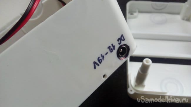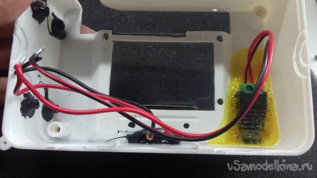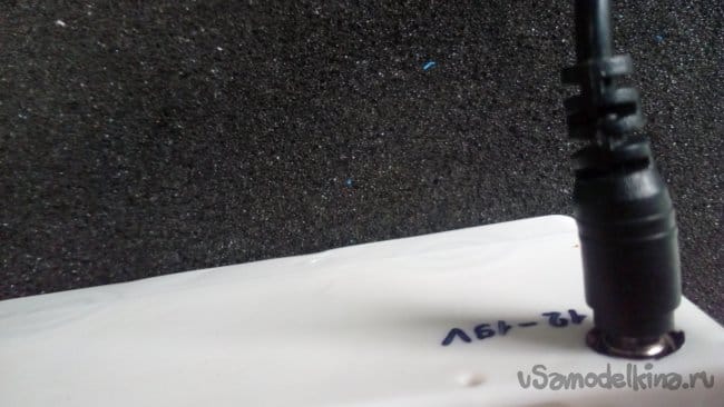 шаг4. Сверлим отверстие диаметром 8мм для разъема питания и акустической колодки. колодку фиксируем винтами и гайками м3, разъем питания заливаем клеем.