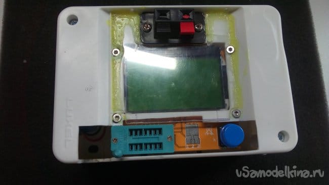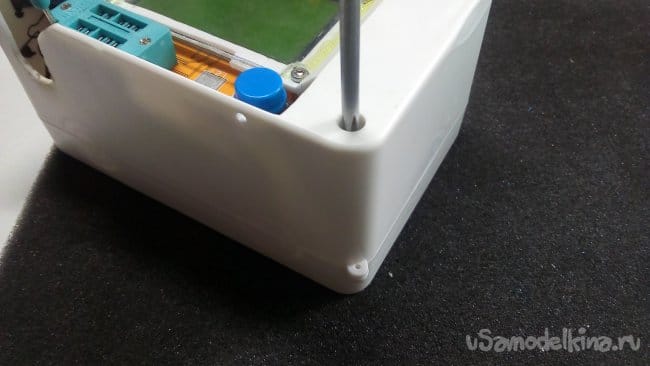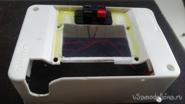 шаг3. Разбираем корпус и вырезаем место для дисплея, колодки, кнопки и делаем отверстия под винты для крепления платы, вырезаем кусок стекла и клеим сверху для защиты дисплея.