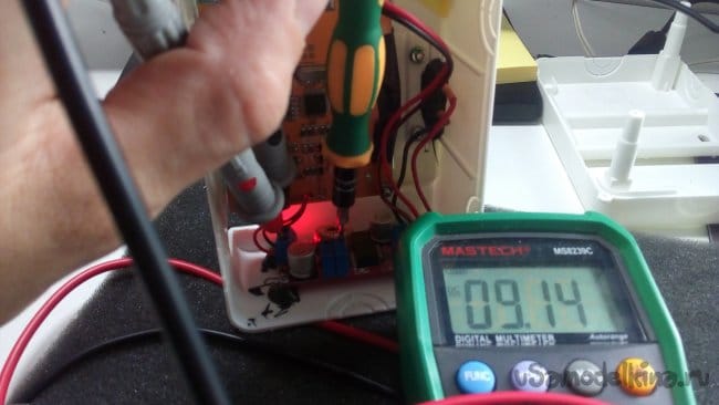 шаг8. Настройка выходного напряжения модуля. Тут потребуется мультиметр и источник питания, у меня данным источником выступал китайский блок питания на 12в, подключенный в разъем питания. После подключения берем мультиметр и ставим в режим проверки постоянного напряжения DC. Устанавливаем щупы на выводы OUT+ (Красный щуп) и OUT- (Черный щуп) и тонкой отверткой начинаем крутить потенциометр, пока на дисплее мультиметра не увидим нужные нам 9в. На этом настройка модуля закончена.